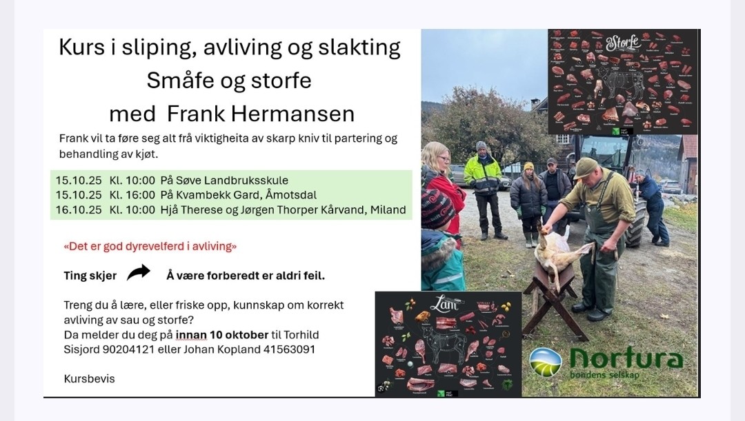 Nortura arrangerer avlivingskurs for småfe og storfe 3 ulike stadar i Telemark 15. og 16. oktober. I tillegg til avliving vil du få innføring i «kunsten» å slipe. Godt utstyr er halve jobben.