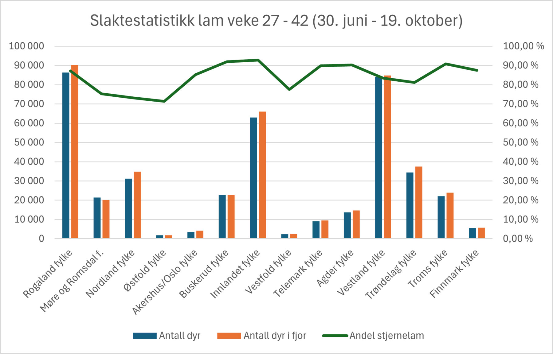 (27.10.25) Veke 42 (13/10-19/10) er inne i slaktestatistikken. I denne veka slakta Nortura 49 600 lam. Medel slaktevekt var 18,05 kg, 0,3 kg over tilsvarande veke i 2024. Det betyr at slaktevektene på lam for alvor er på veg nedover nå, som vanleg er mot slutten av slaktesesongen, men at vi framleis er over fjoråret.